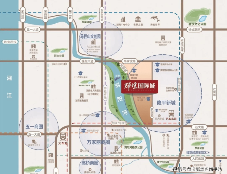 辉煌国际城——项目位于湖南省长沙市芙蓉区浏阳河风光带东侧,处于芙蓉生态新城的核心区域。辉煌国际城位于远大路芙蓉生态新城核心,芙蓉生态新城由政府斥50亿巨资倾力打造,在“二带、两心、三轴、五区”的总规划指导下,随着营盘东路浏阳河大桥的拉通、“三纵三横”路网建设,一个由城市主干道远大路、营盘东路、万家丽路、滨河路环绕的的城市次中心和生态居住区正在成为现实。