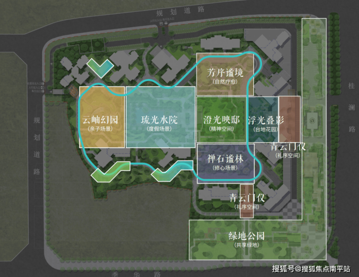 项目通过大围合式建筑布局,释放出 约5.3万㎡景观大园林,以“云岫幻园、禅石谧林、澄光映邸、芳序谧境”等四大主题景观系统,融汇儿童游乐、健身社交、度假会客等多重功能,在城市中心营造出一处可游可赏的“微度假场景”。