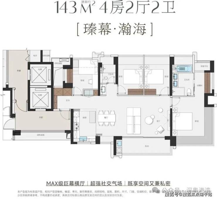 项目主打115-143㎡纯四房,采用4梯5户及专梯入户设计,空间利用率极高。