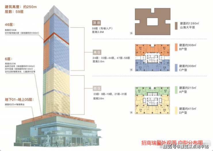建筑总层数:地下01-地上05层为商业、地上08-59层为品质公寓