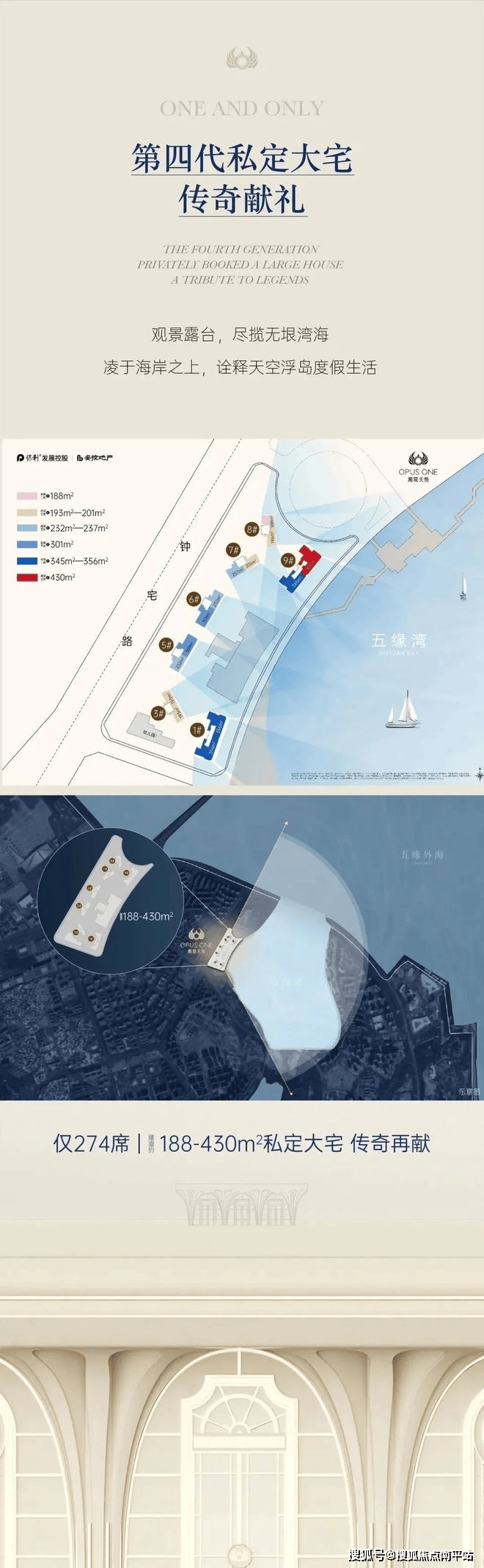 • 产品规划:共规划7栋楼,仅274套房源,户型面积为188-430㎡,前排为345-430㎡超大户型,后排为188-301㎡大户型,全独立电梯厅,圈层纯粹。项目还拥有厦门唯一的三会所配置,大门屋顶会所将打造无边际泳池,可俯瞰五缘湾美景。
