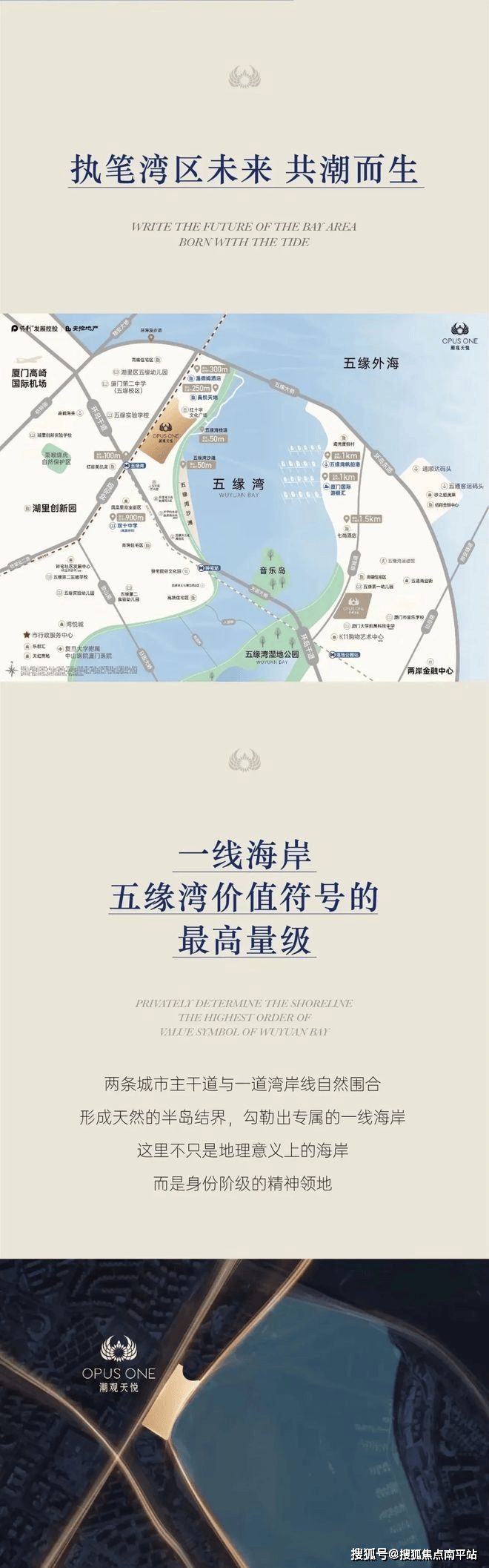 • 地段优势:距离湾岸线仅约30米,步行约50米即达木栈道,约700米可至外海前沿,是五缘湾片区在售项目中唯一南面朝湾的,拥有南侧约1500米超宽视距,纵距约2000米,与恒禾七尚形成“地标对望”景观。