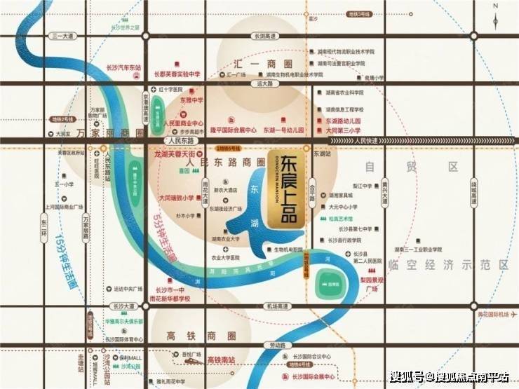 目位于人民东路与合平路交汇处西南角,地处隆平高科技产业园大片区、浏阳河芙蓉滨水产业带附近,是星沙国家经济开发区、高铁新城、长沙市中心、临空经济示范区、马栏山V谷的几何中心。项目商业地块紧邻城市主干道人民东路,为地铁6号线(在建)/8号线(规划)上盖物业,住宅地块则临近区域核心景观资源——东湖公园,整体资源环境优越。