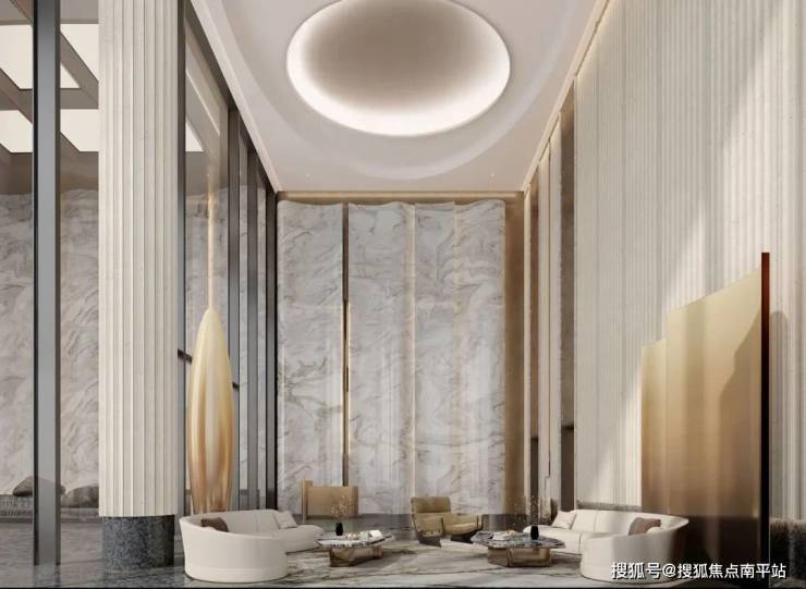 第二重,首层大堂,约9米奢阔挑高,多种石材与贵金属碰撞,石材为原产地拼接,犹如进入了奢石博物馆,有里子,更有面子。