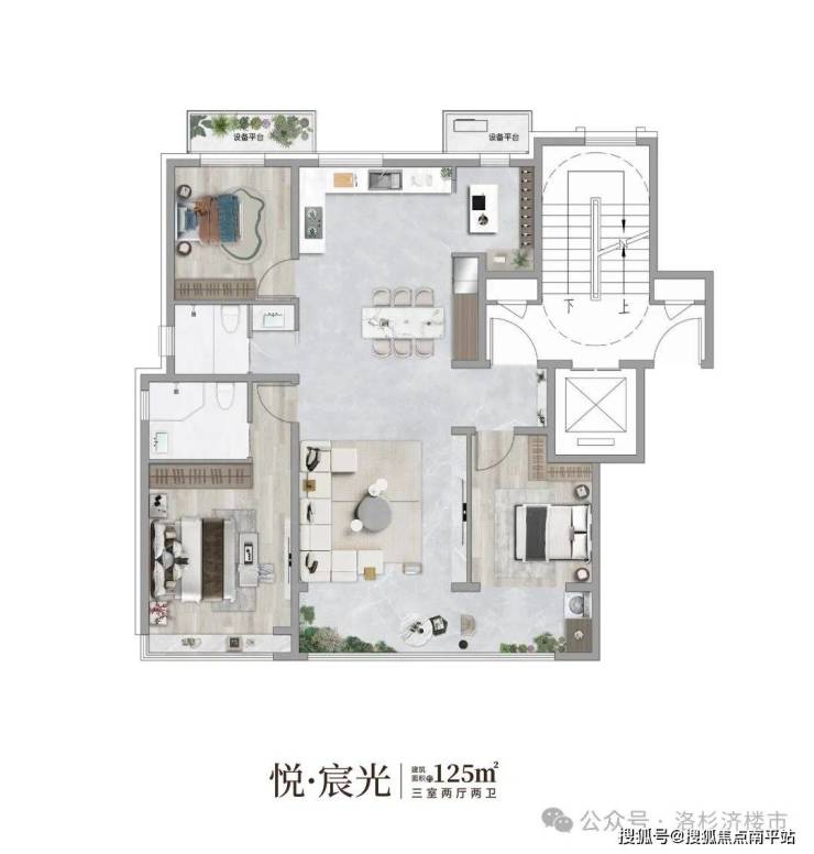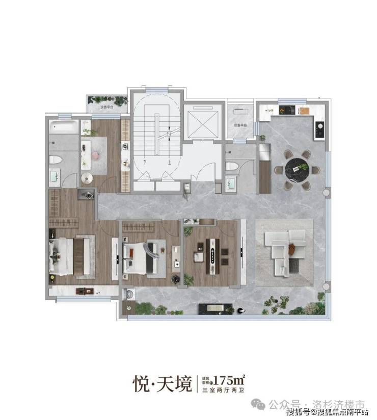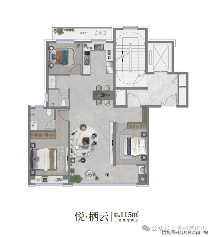 建筑面积约115㎡ 三室两厅两卫双联阳台搭配全景落地窗,尽揽无界视域主卧套房设计,私域之上的峯层谧境U型厨房空间,峯层生活的烹饪美学主次双卫配置,重塑私密尊荣北面配置约5㎡设备平台,给生活N种可能