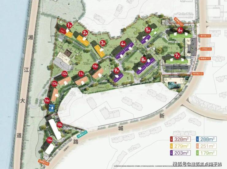 台地式布局:项目背靠原生山体,规划14栋住宅,台地式布局。整盘内凹设计,东高西低,错落有致,项目地块比湘江中路抬高约15米,可看江又无噪音烦忧。