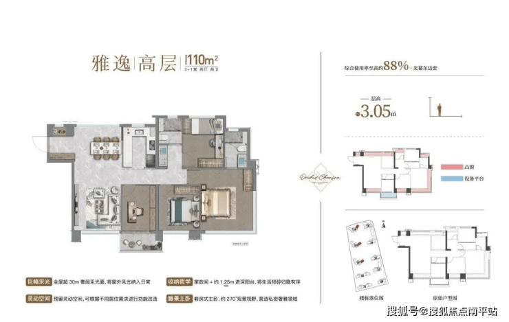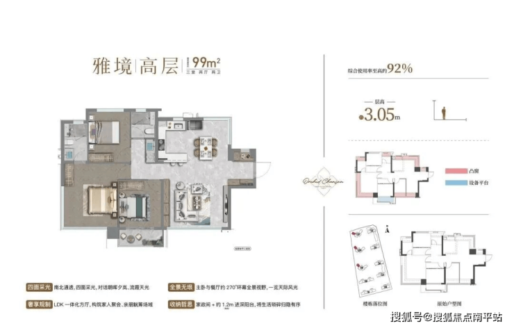 1、层高3.05m,综合使用率约92%,颠覆级拓展(卫生间凸窗、厨房凸窗);