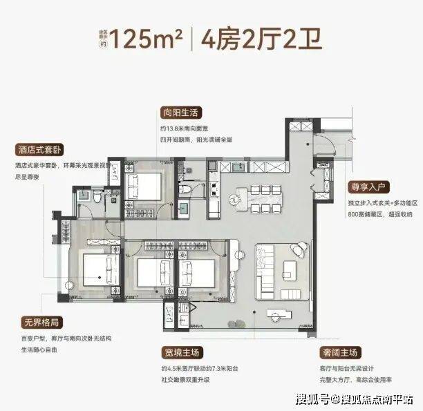 比如联发嘉悦府打造的建面约89-139㎡户型,里面有很多户型 客厅与南向次卧之间都采用了无承重墙的设计,像建面约125㎡户型整个户型就能拥有更多可塑的公共空间,再加上LDKB一体化的设计,让整个户型实现了打造横厅全开放空间的可能。