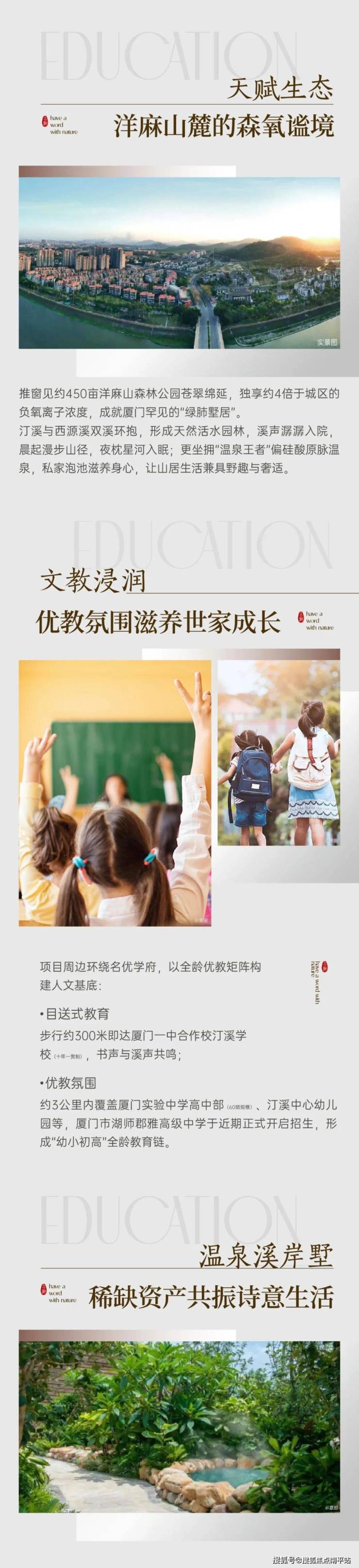 【自然资源】 山:毗邻450亩洋麻山森林公园,享云顶山、文山、北辰山环抱 水:地处国家生态保护地,临近汀溪水库 泉:紧靠天然原脉温泉出水口,直供社区温泉用水,享天然涵养 林:森林覆盖率高达68%,厦门城市“绿肺”,富氧宜居