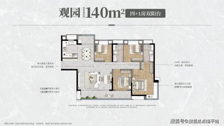 建面约140㎡四房两厅两卫,配备约 8.5 米跑道式阳台,约5.5 米阔绰客厅与客餐厅一体化设计,南北双阳台分区明确,主卧 270° 观景飘窗拓展视野,满足三代同堂的舒居需求与社交场景。