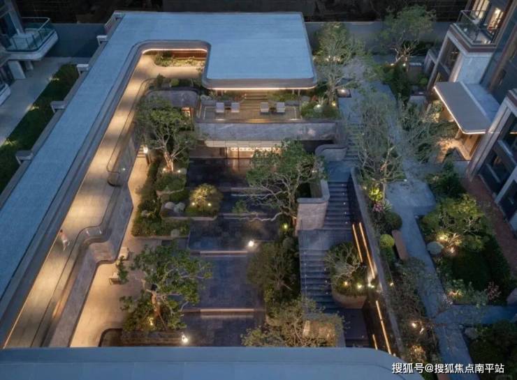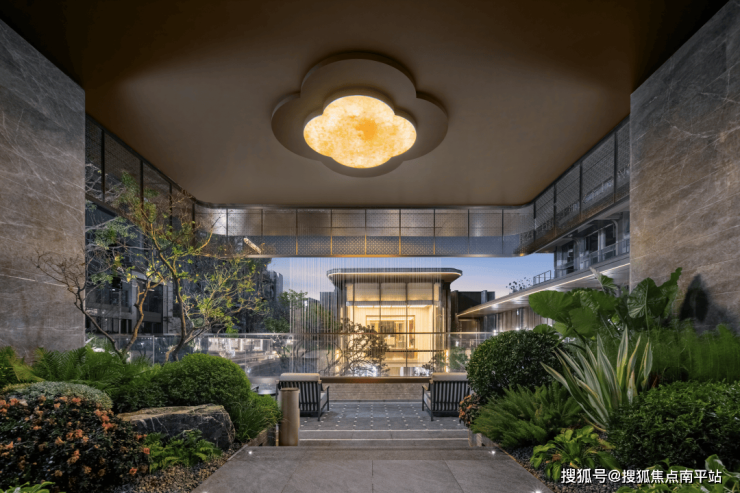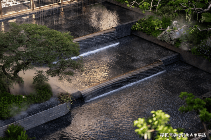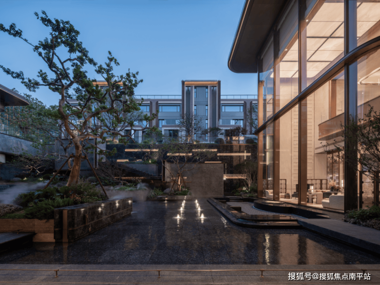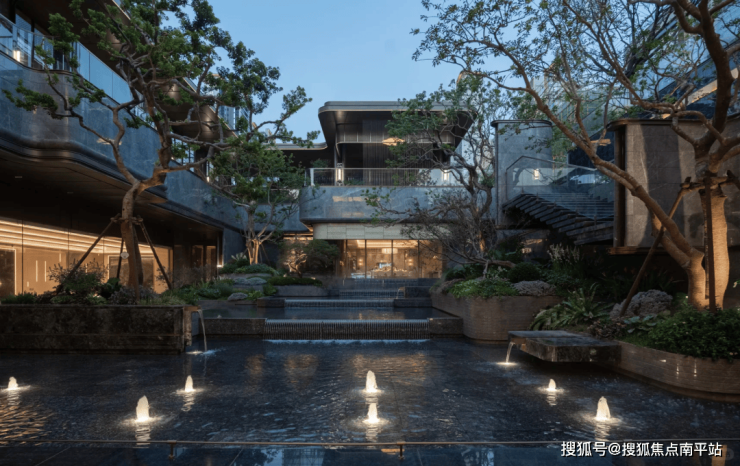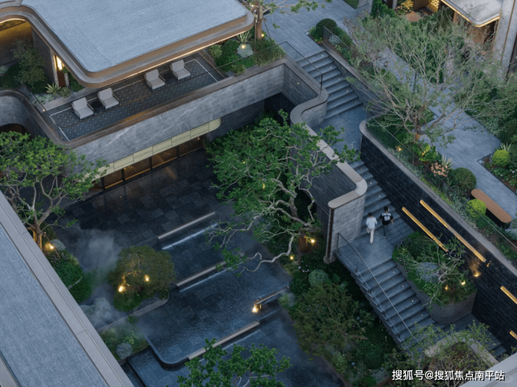 环形港湾之上,孤植一株造型独特的名贵罗汉松,四季常青,寓意守财、吉祥与长寿,彰显家族身份与尊贵;16口喷泉环绕,池心海棠纹树池巧妙融合古厝纹样与现代设计,一步一景,步步生花,尽显雅致与生机。