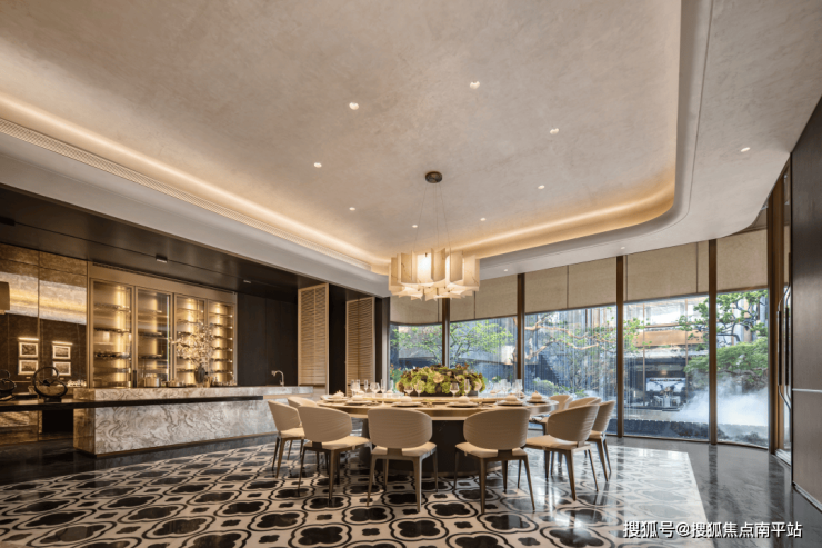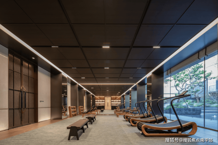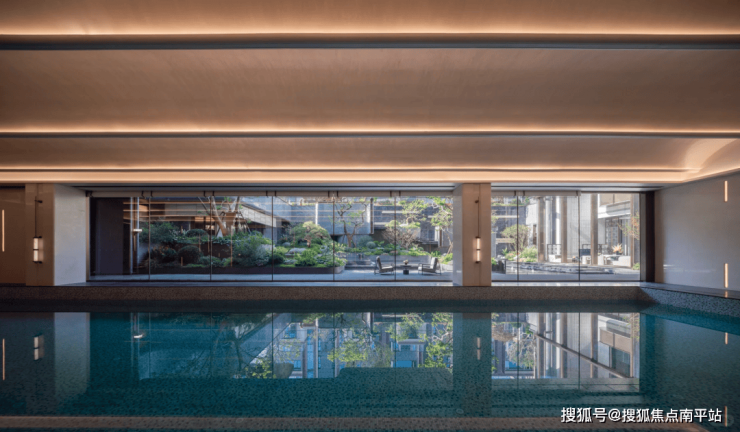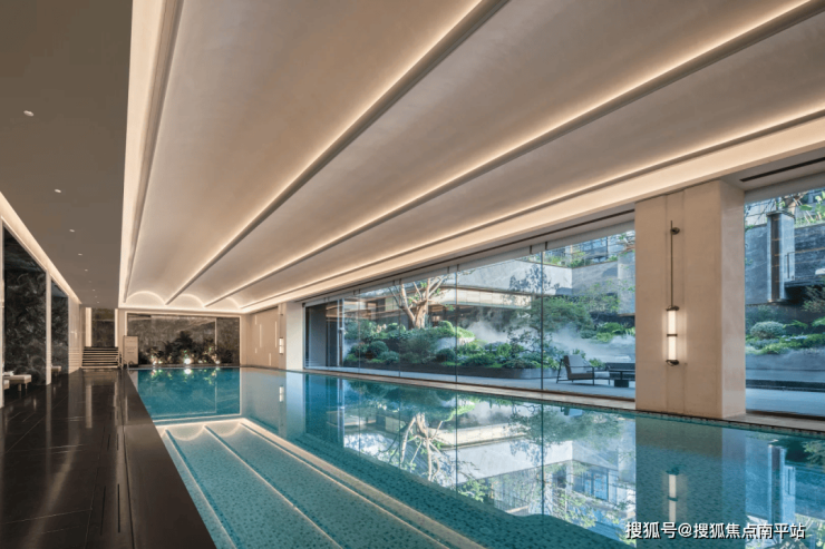 四季恒温泳池,宛如“海棠碧波”般静谧动人。巨幅玻璃幕墙将山水中庭的雅致景致尽收眼底,仿佛将山水画卷融入池中。以故乡山水为灵感,山水中庭将“山、海、天”的壮丽融入日常,镜面水景映照天光,背景的精奢景墙借景出砖入石,重现“厝中有天地”的东方意境,让每一刻都充满诗意与雅致。