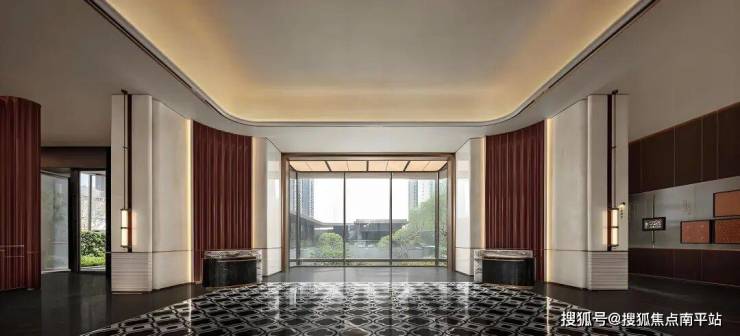 建筑外立面以燕尾山花寓意塑造天际线,赋予建筑舒展形态;大玻璃窗与鎏金线条流畅衔接,从土地向天空生长,与闽南红土共呼吸。在燕尾脊与天空的对话中,重塑当代闽南艺术,让厝宅焕发向上生长的活力。立面精选闽南红釉面陶板、砖红铝板,搭配香槟金线条与爱马仕灰石材,多材质和谐交融,呈现精致大气之美。波浪状陶板于午后阳光中形成“光斑流动”的动态光影,呼应传统天井日晷般的时间感知,实现从厚重传统到轻盈现代的形态转译。
