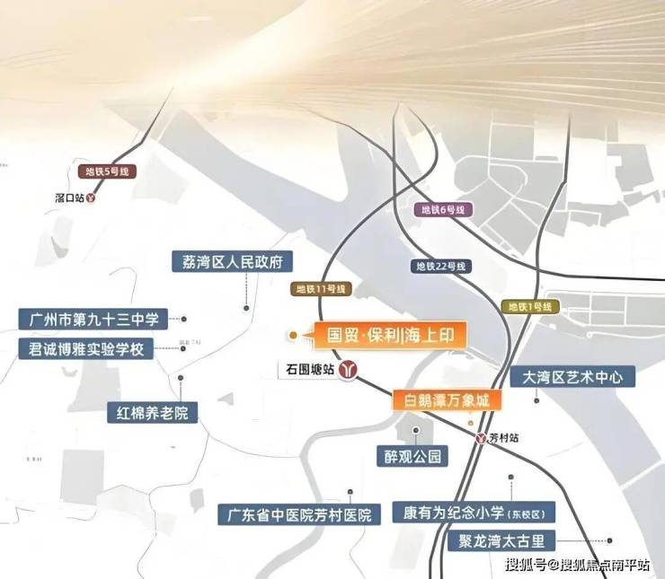 国贸·保利海上印位于广州市荔湾区白鹅潭后航道核心板块、石围塘地段,由国贸地产与保利置业双世界500强国企联袂打造。项目为高品质滨江住宅,总占地面积约9009.07平方米,规划2栋26层高层住宅,总户数约240户,容积率仅3.0,绿化率35.05%,采用带品质装修交付,由保利物业(国家一级资质)进行管理。