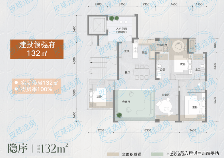 (1)4房2卫,独立电梯厅,得房率差不多刚好100%