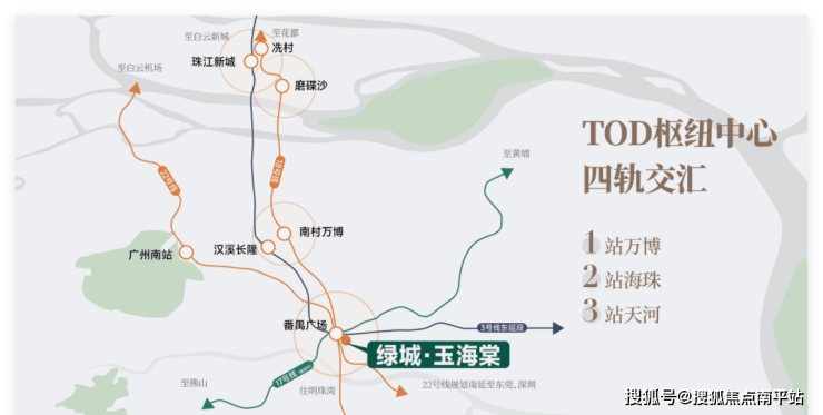 ◎出门即是番禺广场地铁站E口,作为18号线、22号线、3号线、17号线(规划中)的交汇站,轨道“黄金链”之上,通勤顺畅便捷