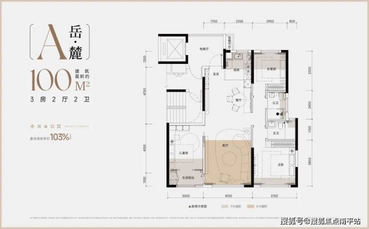 1、经典南北通透布局,新规产品含电梯厅得房率高达103.3%,实得面积约103.3㎡,堪比老规117㎡户型;