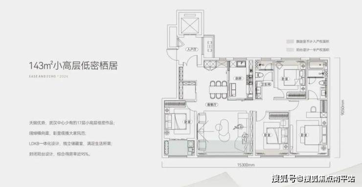 143㎡精致小高层,尊享四室两厅两卫布局,南向观景面宽达15.3米;四开间均朝南,客厅宽敞开间约5.4米;配备约2.1米进深阳台,双阳台设计搭配全赠送的飘窗,实现高达约95%的优化得房率。此外,含约6.6㎡电梯前室,得房率进一步提升至99%,空间利用最大化。