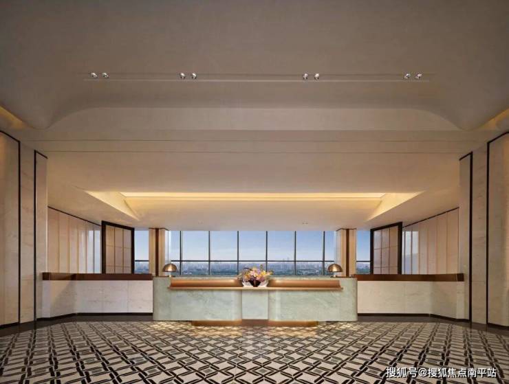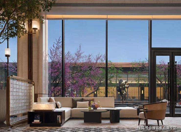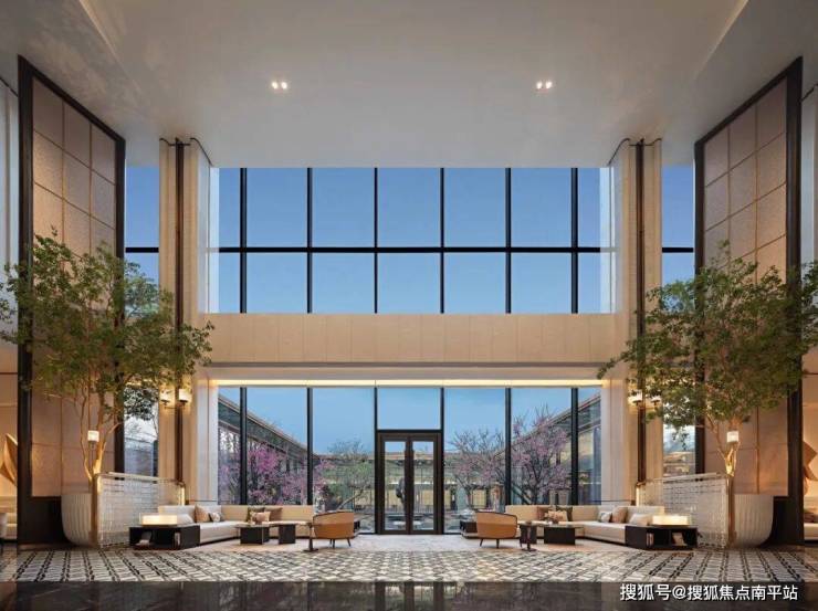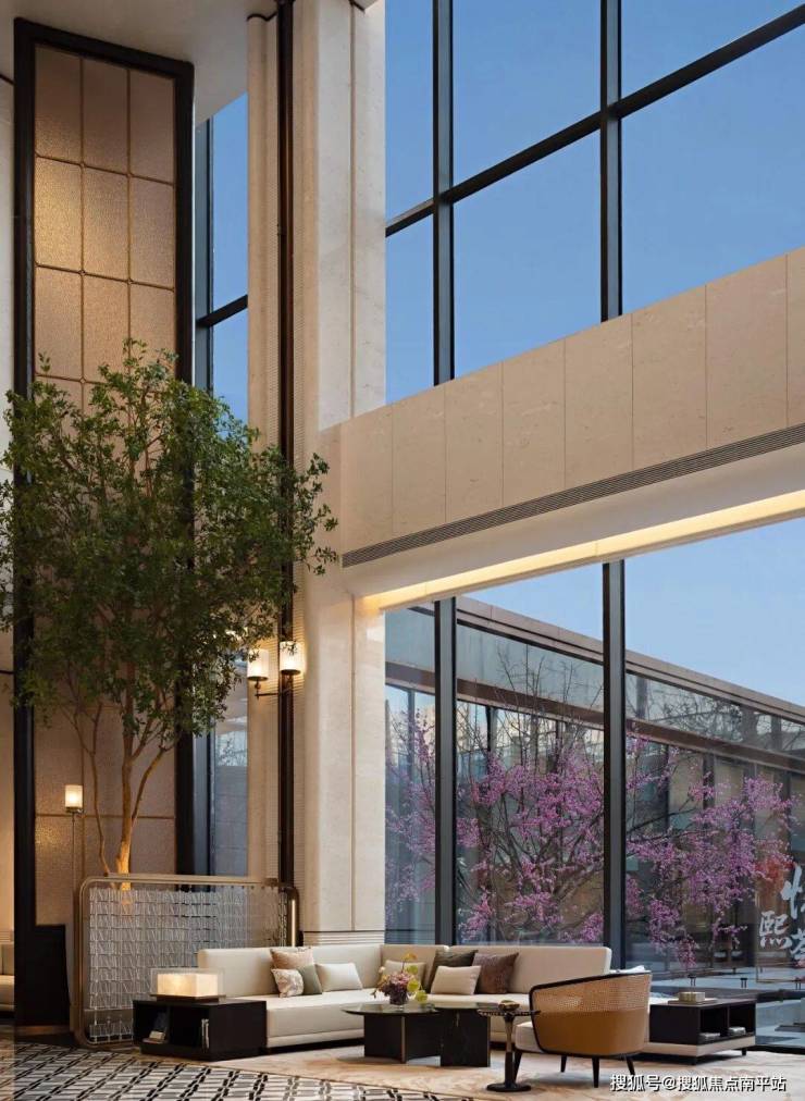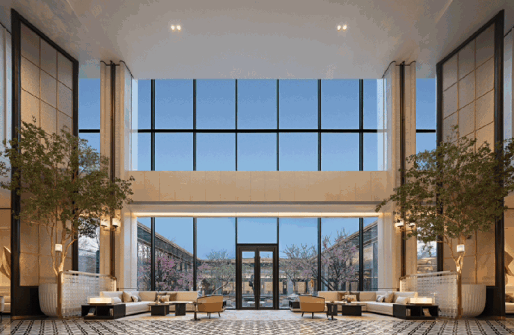 全景玻璃幕墙将庭院叠山理水引入室内,使室内外形成借景互文的空间关系。光以多维体系构建立体照明,天花光膜如晨光洒于宣纸,乔木光影随时间游移,空间在卷轴中生辉。
