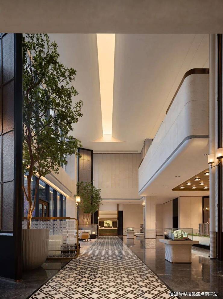 作为空间叙事的起笔,一层接待大堂不仅承担迎宾功能,更被设定为整座会所“卷轴式空间叙事”的起点。项目整体将教育、生活与社区公共空间深度耦合,通过立体会所、下沉庭院与架空层系统的自然叠加,使公共空间进化为品牌精神传达者。