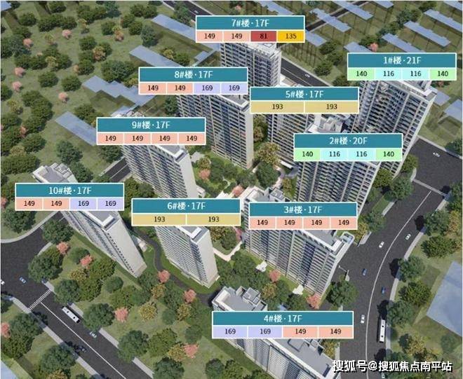 楼层状况:10栋(17-21F)。具体为:1#楼(21F)、2#楼(20F)、3-10#楼(17F)