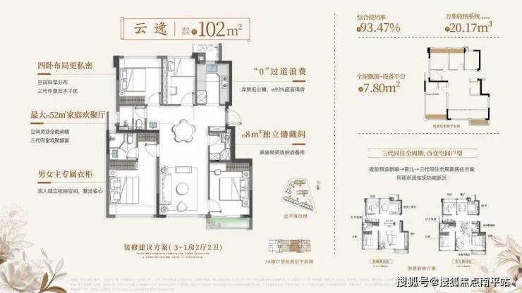 102㎡户型得房率约93.5%;
