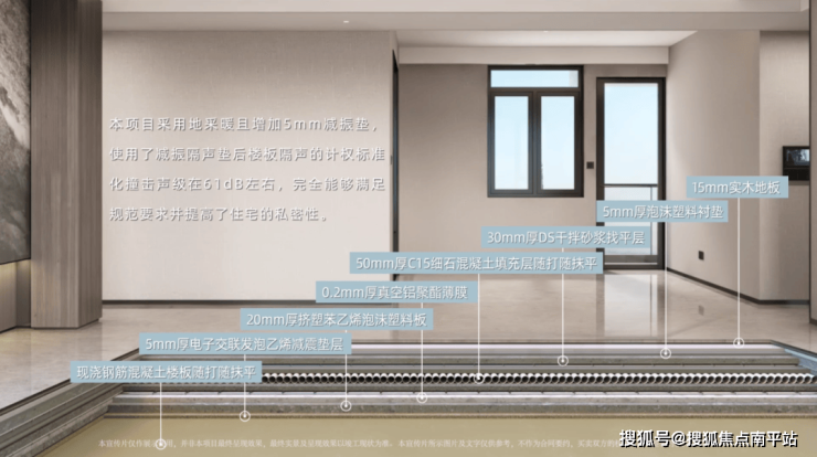 楼板静音技术与分户墙静音技术,楼板中多加约5mm隔音减震垫层,分户墙采用全现浇混凝土重质墙体,有效隔绝了楼上、隔壁邻居家的一切噪音,再也听不到那生涩的练琴声、家庭的聚会、儿童的欢笑......沉浸各自美好生活,更享受和睦友好的邻里关系。