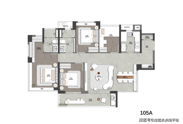 建面约105平户型,四开间构筑约12.8米南向面宽,带来超强通风、全明采光。