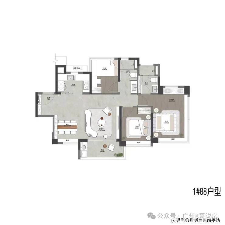 建面88平三房两卫;