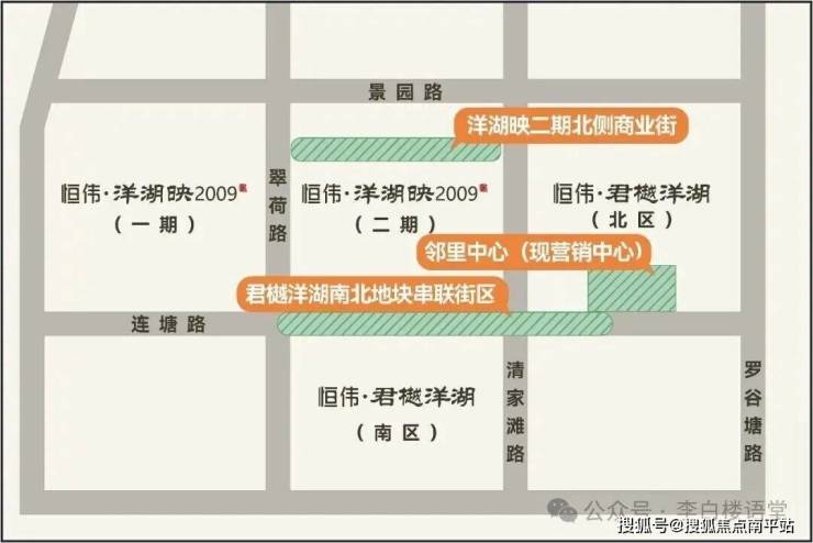 具体打造方式上,结合君樾洋湖和洋湖映2019两个楼盘外部的公共区域,打造2条景观绿化带、2大商业街区、1个邻里中心!