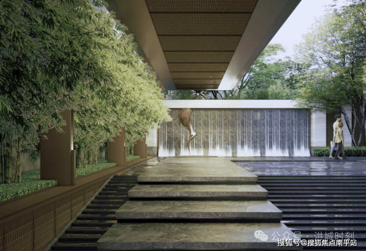 小区共设置南、北2个出入口,南面主出入口打造了酒店级落客系统,整个大门设计为金属屋顶,落在转角石材景墙之上,诠释出立体飞檐意象,的确很有高端酒店格调。
