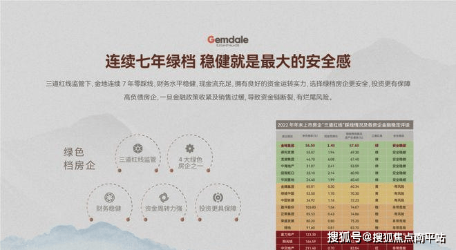 ▪金地集团成立于1988年,35载沉淀,布局全球86城,连续七年销售额破千亿。三道红线政策下连续七年零踩线,财务水平稳健,选择绿档房企更安全,投资更有保障。