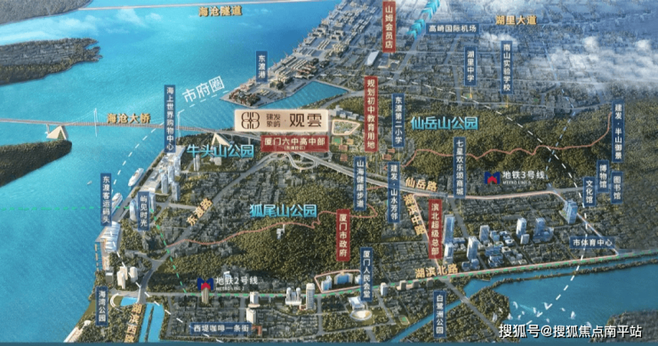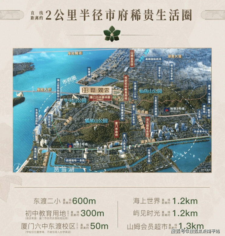 项目占据东渡片区“山、海、城、港”四重资源交汇地,北靠仙岳山、南瞰狐尾山滨海公园,步行可达山海健康步道,生态浓度为岛内天花板。同时位于市府滨北生活圈2公里内,商业、教育配套成熟,自建幼儿园及东渡二小、厦门六中等教育资源,形成全龄教育矩阵。