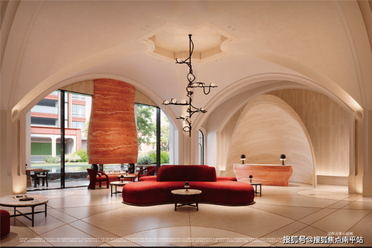 从九龙路起步,在繁花水岸的滨水步道上漫步归家;归家之路在滨水艺境另一侧,是约7000㎡的沉浸式邻里风貌街区,融合党群服务与邻里综合体业态,可在归家路途中感受精致烟火气;之后抵达九龙路归家主入口的河岸艺术大堂,两条地上细分动线,藏着不同的归家意趣: 一条从主入口艺术大堂步入,沿着风雨连廊穿越花园小径,光影透过叶片洒落脚边,风携花香漫过肩头,仿佛逛完一场印象艺术展; 另一条则经风雨连廊直抵“艺术品展列空间”泛会所,或许邂逅正在展出的私人藏品,在艺术氛围中完成圈层身份的过渡。最后步入电梯厅,半圆弧形天花吊顶暗合“天圆地方” 东方哲学,让归家终拾恢弘而宁静的仪式感。