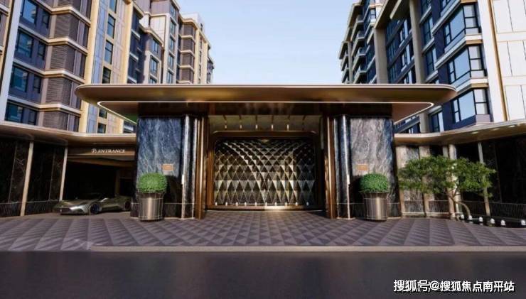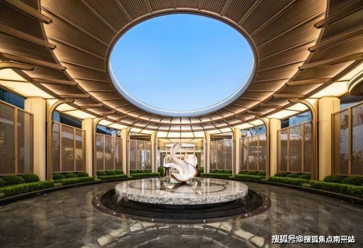 建投·誉河院三期福院的社区大门,以金属线条勾勒鎏金门庭,大堂前庭以古树为核心。