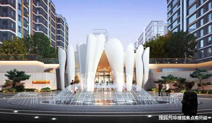 中央是一座整石加工的海棠花瓣水景雕塑,有强烈的艺术氛围。