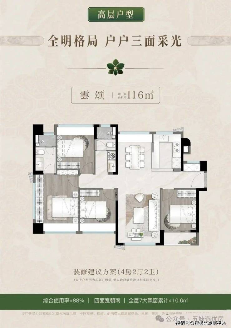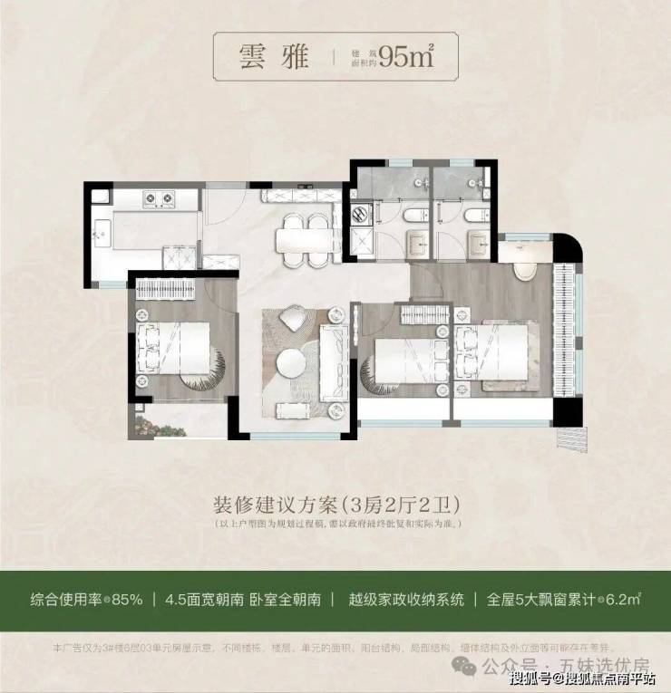 —相当5%的综合使用率打破空桎梏——相当于市面110㎡主推的建面约95㎡越级三房,以85%的综合使用率打破空间桎梏——相当于市面110㎡的实际体验感,让“三代同堂”从拥挤将就变为舒适从容。约13.3米奢阔面宽 + 4.5开间朝南,让阳光成为生活的日常访客,三间卧室皆能时刻被阳光拥抱,长辈房更实现“动静分离”,还附赠南向阳台,为长辈打造专属的休闲天