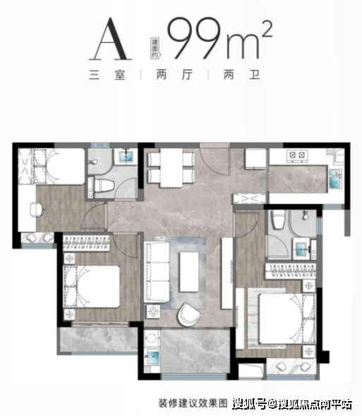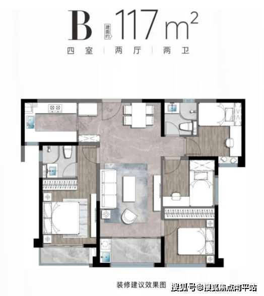 户型方面,98平南向五开间双阳台;117平四房南向面宽约12.3米;128平四房南向面宽约12.6米,主卧约3.2米落地窗。