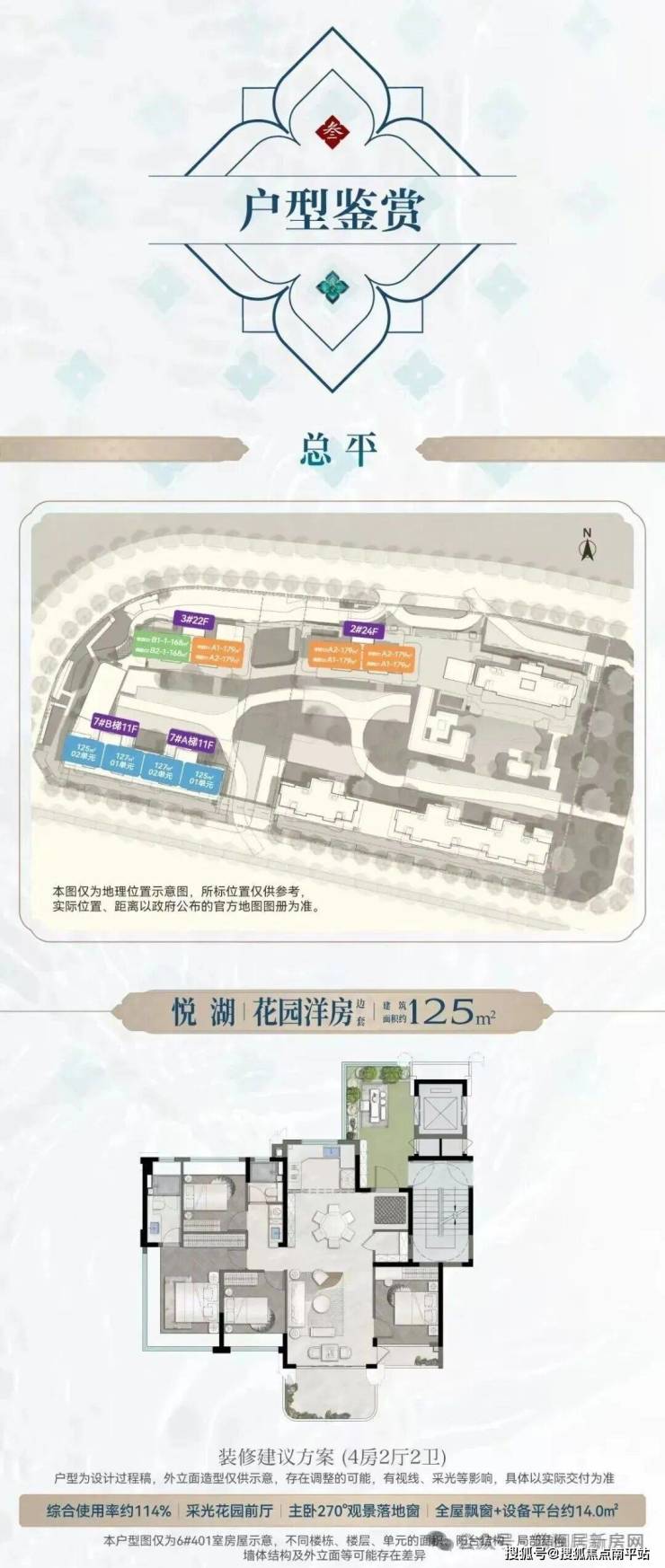 1#楼栋处于小区楼王位置,南北最大楼间距,北向湖园双景(高区瞰湖,低区公园墅),南向直面中庭约380平“群贤观海”叠水景观,东边套拥有超强视距和采光。根据地块规划来看,整栋楼都能享受内外双园景观,“推窗见景,出门入园”成为日常