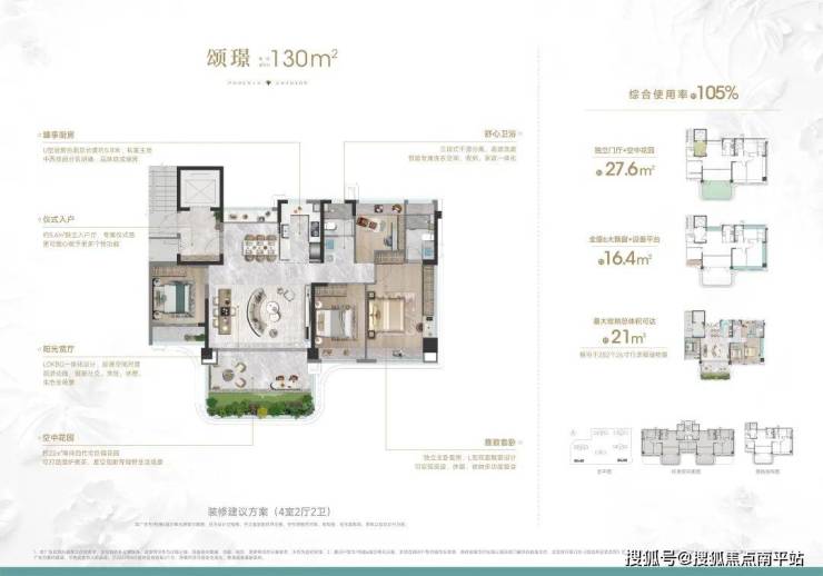 作为第四代住宅, 约130㎡户型偶数层赠送的空中花园面积达到了约22㎡,是目前已知岛外第四代住宅里同面积段最大的空中花园。