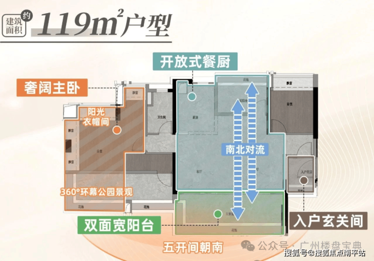建面119平四房,五开间朝南,南北对流设计,主卧360°全景飘窗,阳台和主卧都可以看到晓港公园。