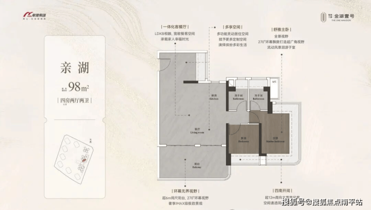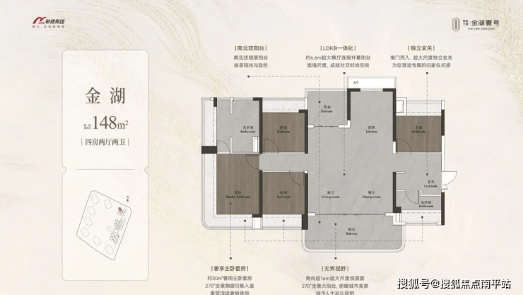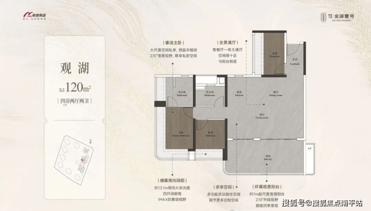 约98-148㎡全南向湖居四房,对标当代华宅范本,创变居住空间的新想象;全南向新规的突破、环拥天地的居住空间、精工雕琢细节之美,打造湖居理想之家,为万博CBD钜献湖居壹号作品。