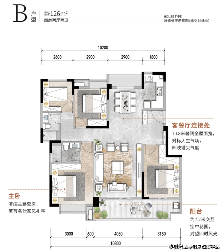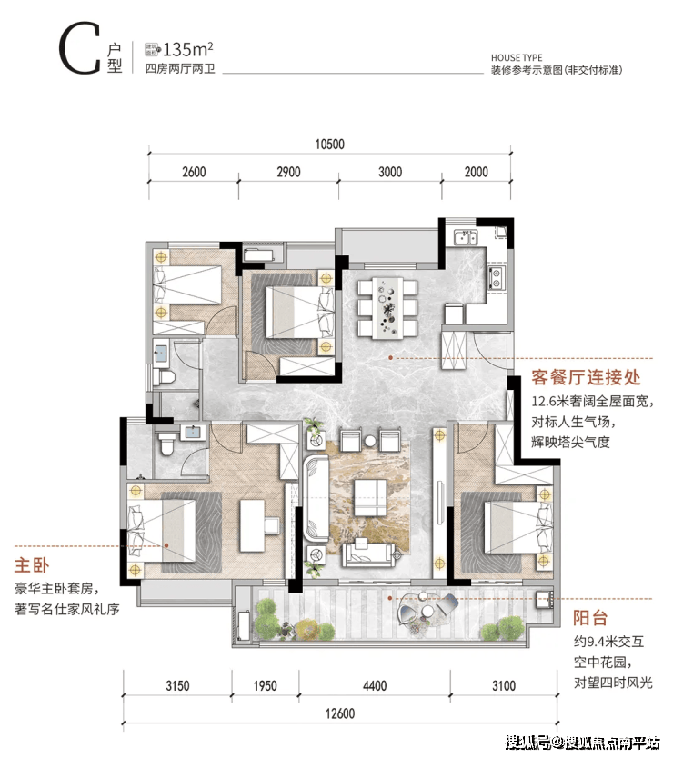 还有建面约108㎡三房,突破性实现南北通透,大面宽观景阳台,大景观视野面和采光面;建面约126㎡舒适四房,三开间朝南;建面约135㎡户型奢配豪华主卧套间,9.4米空中花园阳台。