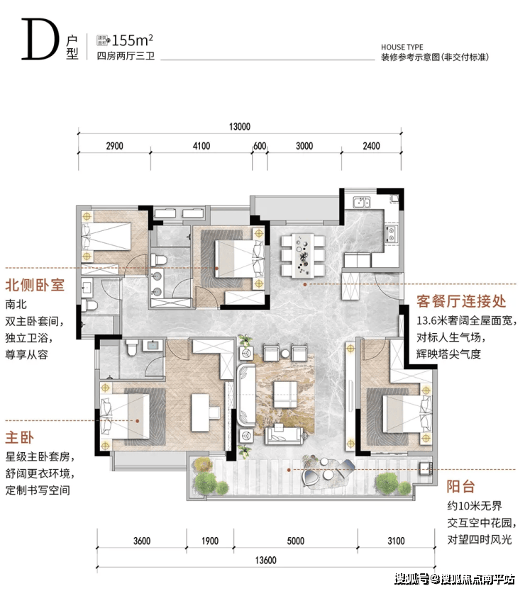 对于终极改善客群来说,可以重点关注 建面约288㎡的联排,拥“约23㎡奢阔挑空设计+超长宽景阳台+豪华总统套房式主卧+奢阔顶层观景露台”,更高空间利用率,拥有大平层无法比拟的空间感,居住舒适度再上一阶。