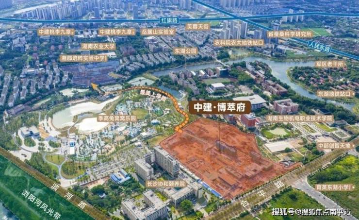 芙蓉区合平路与滨河路交汇处,东至合平路,南至滨河路,西至在建的东湖公园,北至生物机电学院东湖校区。在整个隆平新城来看,地段不算太好,个人觉得地段上对比要逊于桃李九章。