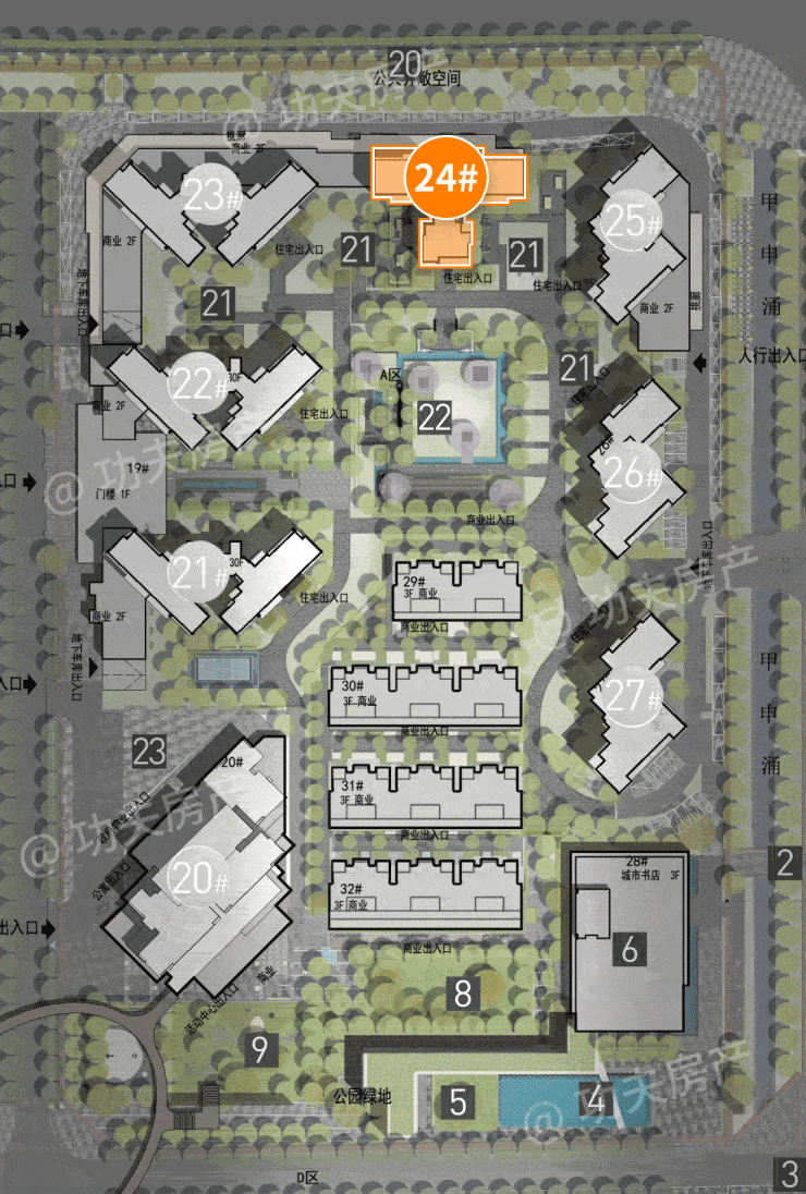 24座位于A区中心位置, 两梯三户 低密度 设计,南北视野开阔, 南面奢享约200米巨幅中轴园林。
