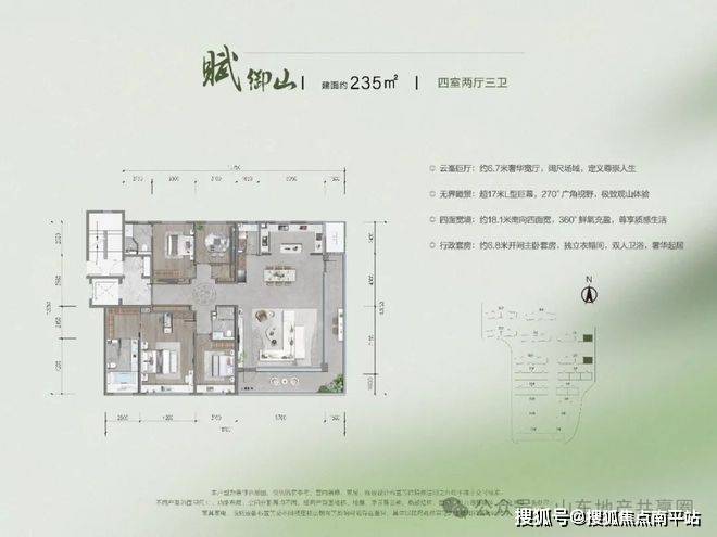 以极致产品造诣,臻筑4-8层约165-240㎡无界观山洋房,尊崇双玄关礼序,南向巨幕面宽,LDKG奢华通厅,行政级主卧套房,极目阔景阳台,270°浮岛瞰山等设计,颠覆济南墅居想象。