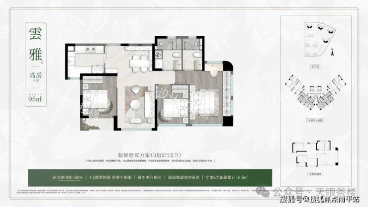①约95平三房:南向4.5开间设计,主卧位于"延年"吉位,厨房占据"天医"方位。