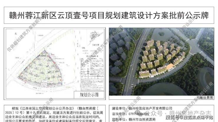 赣州蓉江新区云顶壹号项目规划建筑方案批前公示,项目位于蓉江新城赣南大道东南侧、潇雨东路北侧,建设单位为赣州榕盈房地产开发有限公司,用地性质为居住用地(含二类城镇住宅、城战社区服务设施用地),用地面积60483.9平方米(90.7亩)。本次规划建筑方案有23栋住宅,分别是15栋17层住宅,8栋16层住宅,总建筑面积192794.04平方米。