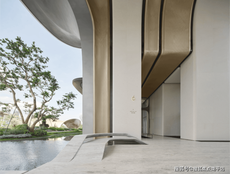 保利天瓒的空间设计,从入口处便实现了扎哈建筑语汇与在地场域的深度融合。向外延伸的流畅曲面如同城市雕塑,多层弧形延续扎哈标志性曲线语言,而 “建筑浸入水面” 的意象则让空间更具自然张力 —— 外立面不锈钢包裹的曲线自然过渡至室内,镜面反射与光影变化随时间流动,使入口成为建筑、自然与城市的对话界面,呈现国际设计语言的本土化表达。